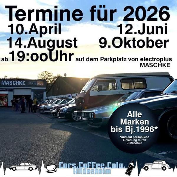 12. Juni 2026 "Cars, Coffee, Cola" in Hildesheim, Bischoffskamp 15 (Parkplatz Electroplus Maschke) ab 19 Uhr